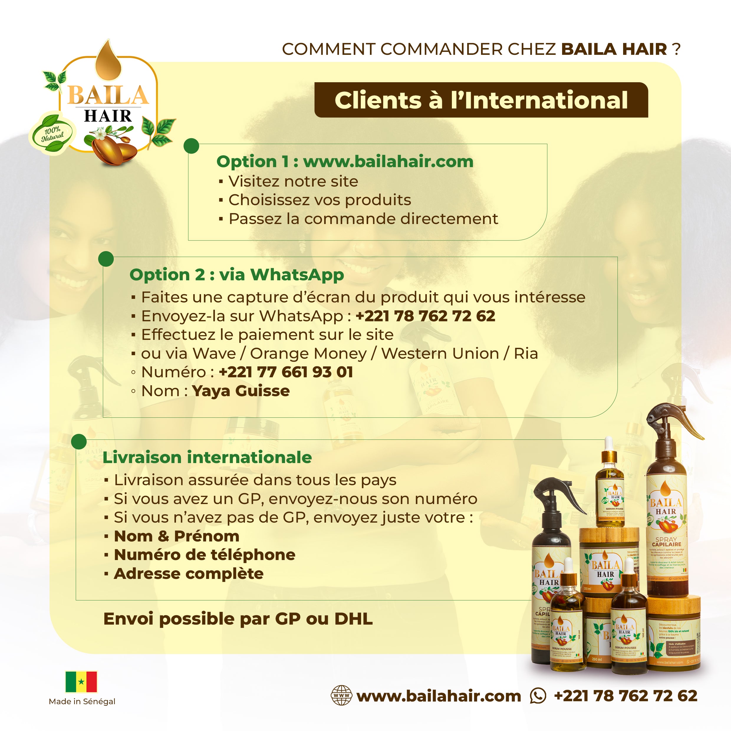 Oui, nous livrons à l’international. Peu importe où vous êtes, Baila Hair vous accompagne pour prendre soin de vos cheveux ! N’hésitez pas à nous envoyer un message en privé pour plus de détails sur la livraison et les délais.